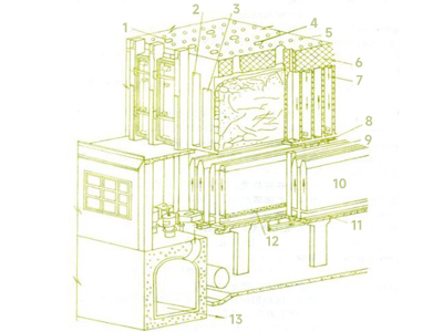 1 - газоотводящие люки, 2 - камера коксования, 3 - камера сгорания, 4 - загрузовые люки, 5 - смотровая шахточка, 6 - свод комеры, 7 - вертикал, 8 - косые ходы, 9 - газопровод, 10 - регенератор, 11 - подовый канал, 12 - насадка, 13 - борова